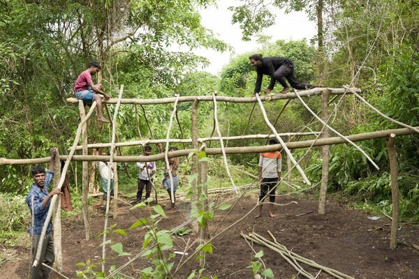 Jenu Kuruba-Familien beginnen mit dem Bau eines Hauses für ihre Ahnen, während sie ihr altes Dorf im Nagarhole-Nationalpark wiederaufbauen © Sartaz Ali Barkat/Survival