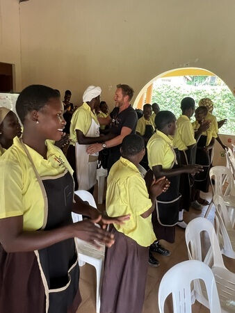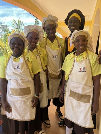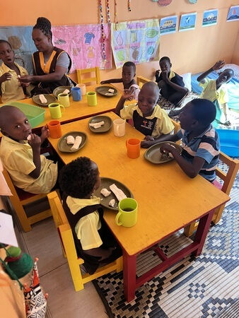 Auch unsere neue Schulklasse freut sich über regelmäßige Mahlzeiten, Milch und Windeln die unsere Näherinnen selber herstellen.
