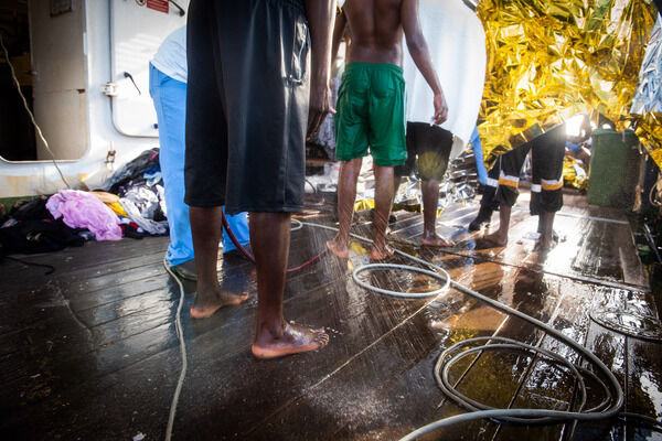 Viele von ihnen waren zum Zeitpunkt ihrer Rettung schwach und orientierungslos und zeigten Symptome starker Belastung durch Benzindämpfe. Auf Anweisung der Ärzt*innen von Ärzte ohne Grenzen wurden Notfallduschen bereitgestellt und Personen mit Treibstoffverbrennungen, Dehydrierungserscheinungen, Unterkühlungen und Vergiftungserscheinungen durch Benzindämpfe versorgt. Gestern Nachmittag wurde schließlich ein Jugendlicher mit schweren Treibstoffverbrennungen durch die Italienische Küstenwache evakuiert, nachdem wir bereits vorgestern Abend die Evakuierung des Patienten eingefordert hatten.