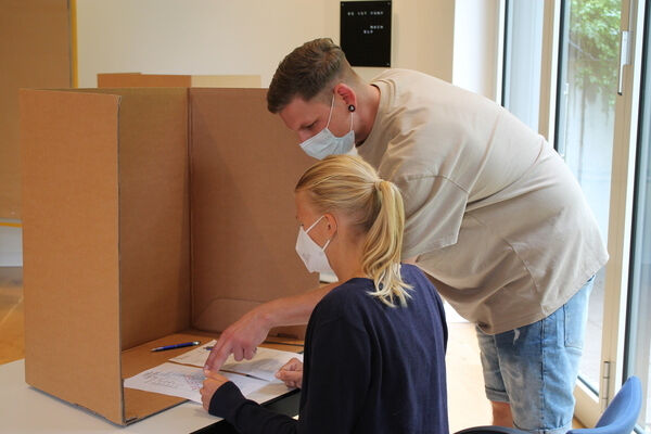 Im weiteren Verlauf stiegen die angehenden Teamerinnen und Teamer selbst in die Praxis ein und waren nicht nur gefordert, ein Wahllokal aufzubauen, sondern es auch im Rahmen eines Rollenspiels zu leiten. Schnell wurde allen deutlich, dass dies gar nicht so einfach ist: Was muss ich tun, wenn eine Person Briefwahl beantragt hat und mit ihrem Wahlschein wählen gehen möchte? Und dürfen Wählende eigentlich ihr Kind mit in die Wahlkabine nehmen? Wie können Menschen mit Sehbehinderung beim Urnengang unterstützt werden?