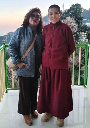 die 53-jährige, nierenkranke Nonne Tenzin Dolma (25 Euro) - hier mit unserer Mitarbeiterin vor Ort