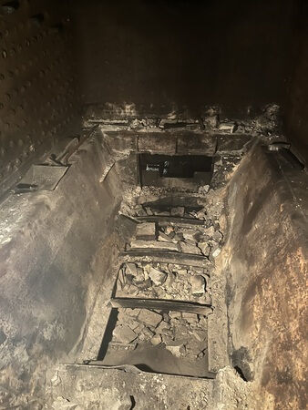 in der Zwischenzeit ist wieder einiges passiert. Da der Kessel in naher Zukunft vom Fahrwerk abgenommen wird, muss auch die Feuerbüchse komplett von ihrer alten Schamottstein-Ausmauerung befreit werden. Daran können wir nun einen Haken setzen. Auch die Öl-Kohle, die im Laufe der Zeit auf dem Boden vor den Öl-Brennern entstanden ist, wurde herausgemeißelt. Auf den Fotos erkannt man gut die blanke Feuerbüchse und ein Bild weiter die beiden Öl-Brenner, die nun auch erst einmal gründlich gereinigt werden