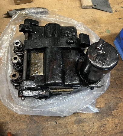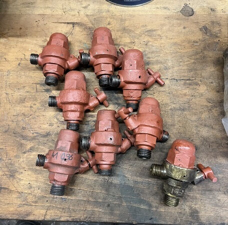 Auch einige Anbauteile sind wieder fertig geworden. Hier zu sehen ist einmal die Schmierpresse für die Luftpumpe und einige Ölsperren, die instandgesetzt, eingestellt und grundiert wurden.