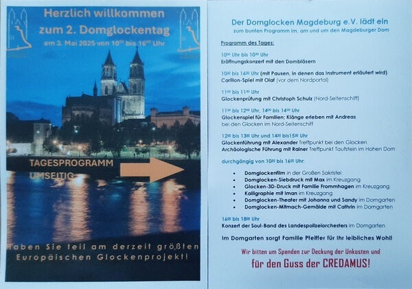 Liebe Spenderinnen und Spender unser Projekt nähert sich seinem Höhepunkt und damit auch dem Ende, was den reinen Glockenguss angeht. Natürlich ist es mit dem Guss der CREDAMUS, der diesen Höhepunkt darstellt, insgesamt noch lange nicht getan. Das Projekt greift viel weiter! Alle Glocken müssen mit Klöppeln und Jochen ausgerüstet werden, deren Finanzierung in der Verantwortung des Vereins liegt. Dann müssen die Türme ertüchtigt werden, die Glocken zu tragen. Die dazu nötigen Schwingungsgutachten wurden bisher durch den Verein bezahlt, im Weiteren ist die Kulturstiftung Sachsen-Anhalt dafür zuständig, die auch den Um- bzw. Ausbau der Türme verantwortet und dazu vom Land Sachsen-Anhalt Mittel im Umfang von 530.000 Euro für die Jahre 2025 und 2026 erhalten hat. Liebe Spenderinnen und Spender, der Verein plant den Guss der CREDAMUS noch für dieses Jahr. Dazu muss mit der Gießerei Gebr. Grassmayr GmbH in Innsbruck/Österreich bis zum Juli ein Auftrag unterzeichnet werden, damit der nötige zeitliche Vorlauf da ist. Zur Unterzeichnung müssen aber die nötigen Finanzmittel zu 100% vorhanden oder zumindest seriös zugesagt sein und daran „hapert“ es zurzeit noch. Es fehlen noch mindestens 50.000 Euro, wenn wir alle Reserven „zusammenkratzen“. Und deshalb unsere Bitte an Sie und Euch: „Lasst in Euren Spendenbemühungen nicht nach! Tragt das Anliegen unseres Vereins, dem Magdeburger Dom, der ältesten und damit bedeutendsten gotischen Kaiser-Kathedrale Deutschlands ein adäquates Geläute von 12 Glocken zu verschaffen, weiter. Ihr habt über diese Spenden-Plattform insgesamt schon über 50.000 Euro gesammelt. Macht bitte weiter! Als „Anreiz“ lade ich Sie/Euch ein, an unserem 2. Domglockentag teilzunehmen und sich vor Ort über das Projekt zu informieren. Er findet am 03.5.2025 rund um den Magdeburger Dom statt. Es gibt viel zu entdecken und man kann auch aktiv sein. Für Essen und Trinken wird gesorgt.