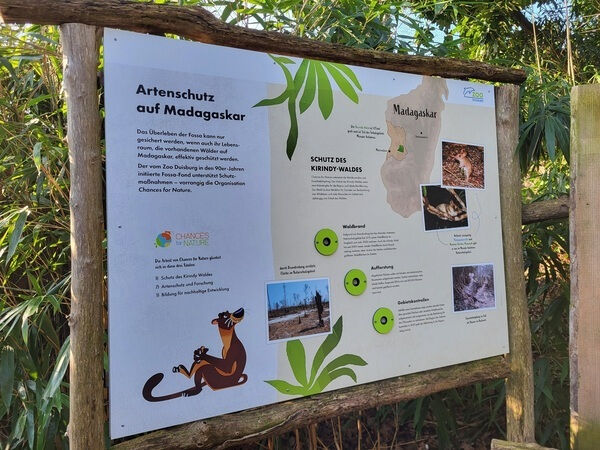 Drehen, klappen, hören: Teil des Warmhauses und der bestehenden Außenanlage für die Fossa ist auch ein neuer Bildungspfad, der ebenfalls vom Förderverein des Zoos durch die Bereitstellung eines mittleren fünfstelligen Betrages finanziert worden ist. Kindgerecht, interaktiv und spielerisch wird hier Wissen über die Fossa und den Lebensraum Madagaskar vermittelt. Besondere Gucklöcher, ein XXL-Rad zum Drehen, ein überdimensionales Buch und weitere interaktive Elemente sind Bestandteile und bieten einen informativen Rahmen für den Besuch bei der Fossa. Ein besonderes Highlight ist die Hörstation: Per Knopfdruck „telefonieren“ die Zoogäste mit verschiedenen Fossa-Experten. Zu ihnen gehören Artenschutz-Koordinatoren, ein Ranger und auch Duisburgs Raubtierpfleger Mike Kirschner.