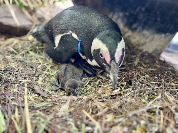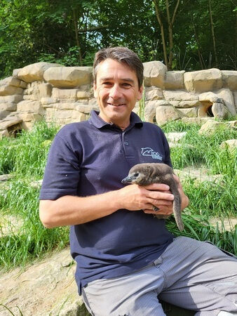 Am 20. April war es so weit: Nach 38 Tagen Brutzeit schlüpfte der kleine Brillenpinguin aus dem Ei. „Man fiebert diesem Moment natürlich entgegen und zählt die Tage“, freut sich Revierleiter Maik Elbers. Vorher wechselte sich das Elternpaar gleichberechtigt und wochenlang beim Brutgeschäft ab. Während ein Elternteil brütet, hält sich der Partner in der Nähe des Nestes auf, schwimmt und sucht nach Nahrung. Mit der bisherigen Aufzucht des Kükens ist Tierpfleger Elbers zufrieden.