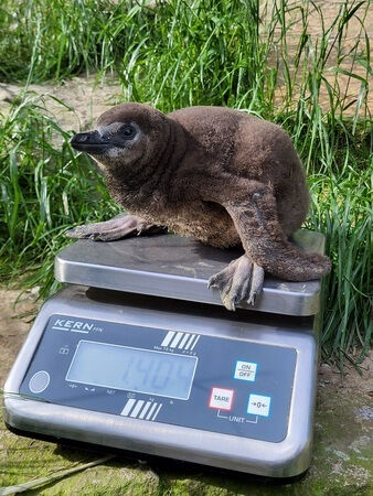 Nach dem Schlupf sind junge Brillenpinguine sehr leicht – weniger als 100 Gramm bringt ein Küken auf die Waage. Danach legt der Nachwuchs täglich an Gewicht zu. Der Grund: fetthaltiger Fisch, denn auf dem Speiseplan der Duisburger Brillenpinguine stehen insbesondere Heringe und Sprotten. Das sind Fischarten, die viel Energie haben. „Zurück im Nest würgen die Eltern den Fischbrei hoch und füttern damit das Küken“, beschreibt der Pfleger die etwas gewöhnungsbedürftige Ernährung der Jungvögel. Im Alter von rund vier Wochen hat der kleine Pinguin sein Gewicht vervielfacht und wiegt derzeit rund 1,4 Kilogramm. Schon bald steht auch der Mauser genannte Gefiederwechsel bei dem jungen Frackträger an. Dabei verliert das Küken schrittweise seine flauschigen brauen Daunen, die durch das charakteristische schwarz-weiße Gefieder ersetzt werden. Erst ab diesem Moment gehen junge Pinguine ins Wasser. „Die Daunen halten den kleinen Pinguin warm, saugen sich bei Wasserkontakt aber voll. Erst nach der Mauser und durch das Einfetten des Gefieders ist der Nachwuchs startklar fürs Schwimmen“, erklärt Tierpfleger Elbers.