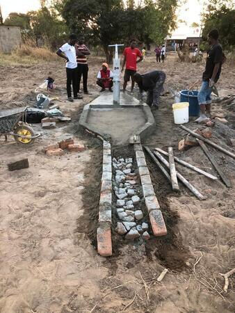 Zum Schluss kommen die „civil works“: Die Plattform für die Handpumpe und der rückstaufreie Ablauf für das überfließende Wasser werden unter der Anleitung unseres Wasser-Managers errichtet: