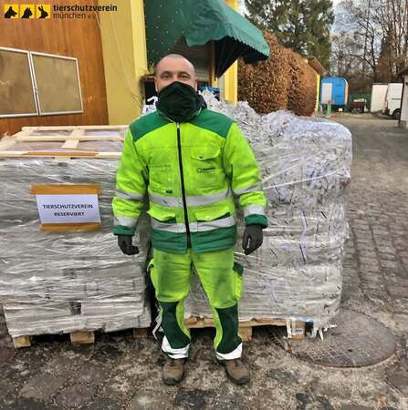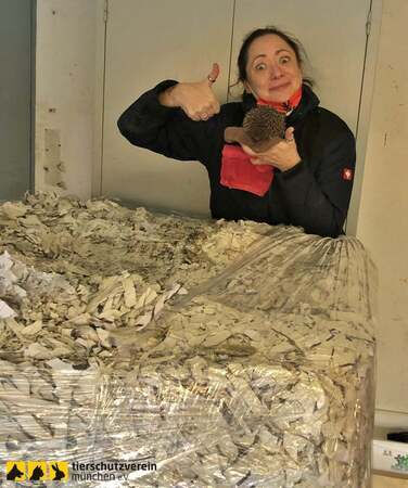 Nicht nur dass das Team uns sofort Unterstützung anbot, sie lieferten auch schon zwei Tage später eine gigantische Menge an Zeitungen. Zwei Paletten, fast eine Tonne Papier mit Igeleinlagen. Als das unsere Mädels aus der Wildtierstation sahen, waren sie den Tränen nahe. Als „Zuckerl“ war eine Palette der Zeitungen bereits so zurechtgerissen, dass die Mitarbeiter nicht mehr selbst Hand anlegen mussten. Das in Streifen gerissene, weiche Papier ist der Füllstoff für die kleinen Häuschen, in denen die Igel sich zurückziehen.
