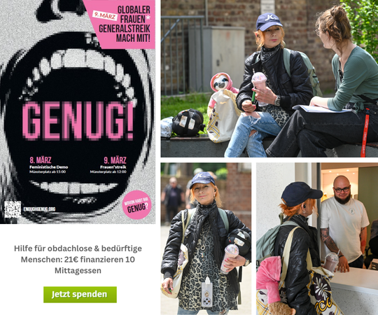 Am 9. März findet Ihr uns auf dem Münsterplatz. Zum Frauenstreiktag machen wir auf eine oft unsichtbare Realität aufmerksam: Frauen sind besonders häufig verdeckt wohnungslos. Statt Hilfsangebote zu nutzen, kommen sie notdürftig bei Bekannten unter – oft in prekären, beengten Verhältnissen und nicht selten betroffen von (sexualisierter) Gewalt und Übergriffen. Viele tarnen sich an Bahnhöfen oder Bushaltestellen als Reisende, um nicht aufzufallen. Ihre größere körperliche Verletzbarkeit – etwa rund um die Menstruation – verschärft die Situationen für Frauen auf der Straße.