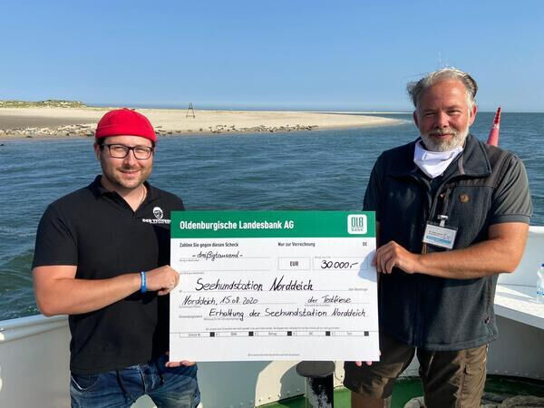 Am Samstag habe ich dann auch gleich die Chance genutzt und dem Leiter der Station, Dr. Peter Lienau direkt vor der Seehundbank einen Spendenscheck über 30.000€ überreicht.