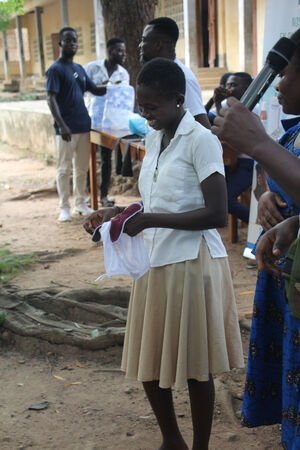Am Ende bekamen die 20 Schülerinnen, die sich am meisten beteiligt hatten, jeweils ein Bindenpaket und nach einem Gruppenfoto war die Freilichtsensibilisierung auch schon vorbei.