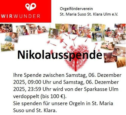 Ihre Spende zwischen Samstag, 06. Dezember 2025, 09:00 Uhr und Samstag, 06. Dezember 2025, 23:59 Uhr wird von der Sparkasse Ulm verdoppelt (bis 100 €).