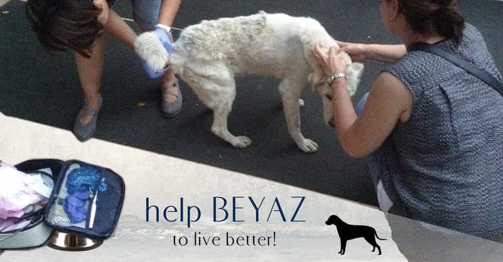 "Beyaz" (turk. "white") is really old dog from the neighbourhood where we feed the cats. He is beeing fed with a minimum of poor qualtiy food but he is not recieving any other care. As a result we found him full of fleas, ticks and parasits, seems like never had a bath or beeing groomed and is suffering a great deal. He has difficulty walking, probably arthritis, and really needs some help. We were lucky enough to find a vet that would come to us for a house call. Please help us to buy medicine and treatment to relieve his pain!