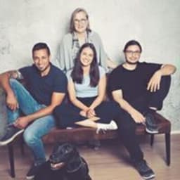 Three joyful people raising hands with hearts and confetti, celebrating together.