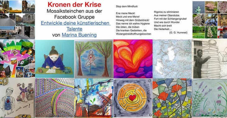 Nach 6 Wochen Quarantäne hier in Italien habe ich gedacht, wir müssen diese Energie der Öffnung nutzen, was Gutes zu tun. Ich habe in meiner sehr aktiven Facebookgruppe mit vielen Künstlerinnen gefragt , ob sie Lust haben ein Mosaiksteinchen zu kreieren. Was hast du Positives aus dieser Krise mitgenommen? So ist dieses Mosaik entstanden, von dem du im Bild nur einen Ausschnitt siehst. Wenn du spendest und mir eine E-Mail schreibst kann ich dir das PDF schicken und du kannst es dir ausdrucken, wenn du möchtest.