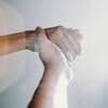Three joyful people raising hands with hearts and confetti, celebrating together.