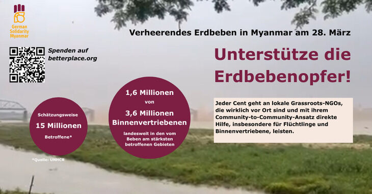 Wir untersützen die Forderungen der zivilgesellschaftlichen Akteuere für ein freies, demokratisches und selbstbestimmtes Myanmar. Dabei erkennen wir an, dass die innenpolitische Verhältnisse in Myanmar kompplex und vielschichtig sind. Die Zukunft des Landes kann nur von innen heraus nachhaltig gestaltet werden. Unsere Hoffnungen liegen in der Verwirklichung der Menschenrechte hin zu Frieden, Föderalismus und Demokratie.