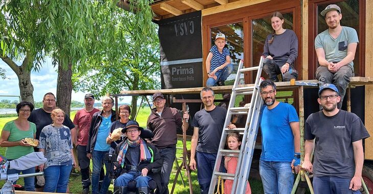 Inzwischen ist ein zweiter Wagen als Tiny-Häuschen fertiggestellt. Wegen Schäden an einem Rad hat sich der Transport des Bauwagens als Jugendwagen verzögert, doch inzwischen ist er an Ort und Stelle und die Jugendlichen haben sich begeistert ans Werk gemacht, ihn herzurichten.