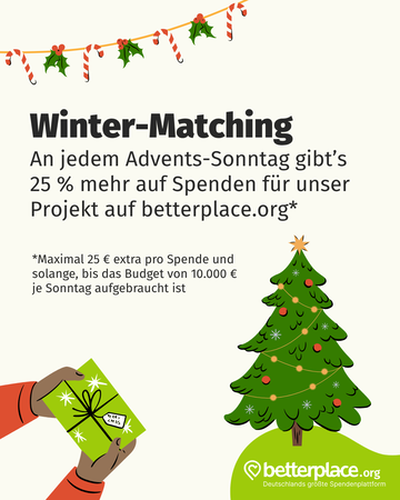 Morgen, am Sonntag, 21.12.2025, findet von 9:00-23:59 Uhr bei Betterplace eine Winter-Matching-Aktion statt: auf jede Einzelspende legt Betterplace 25% obendrauf. Der maximale Bonus beträgt 25 € pro Spende, solange das Aktionsbudget von 10.000 € für diesen Sonntag nicht aufgebraucht ist.