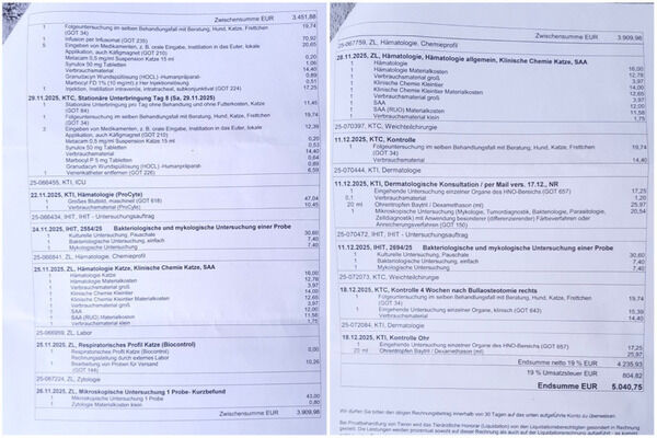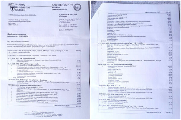 Liebe Unterstützerinnen und Unterstützer, wir möchten heute mit euch noch die vollständige Rechnung von Suses Ohrpolyp-Operation und der Nachbehandlung teilen; so könnt ihr sehen, wo die gesammelten Spendengelder hingehen.