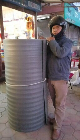 Insgesamt möchten wir folgendes kaufen: 4 Betten, 14 Matratzen, 14 Decken mit Bezügen und 28 Meter Bodenbelag.