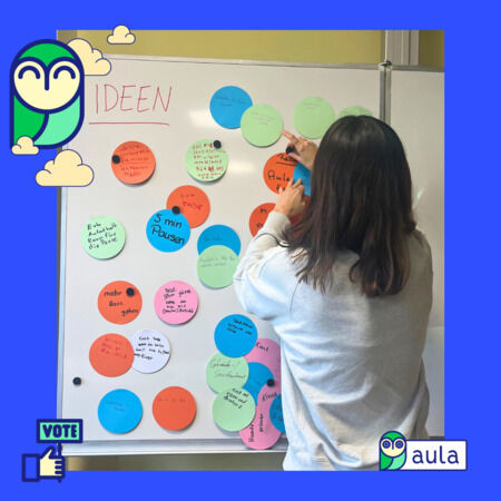 Hier ist unser aula Team im November 2024 gerade bei einem aula-Workshop am 'wilde Ideen' Sammeln an einer Schule.