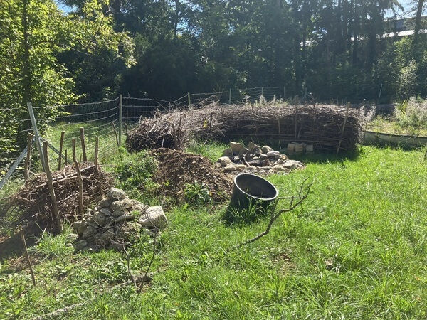 Mit dem Anlegen einer Benjeshecke und dem Aufschichten einiger Steinhaufen sollen diverse Lebensräume für eine vielfältige Tierwelt angeboten werden. Vielleicht siedeln sich bald Zauneidechsen an.