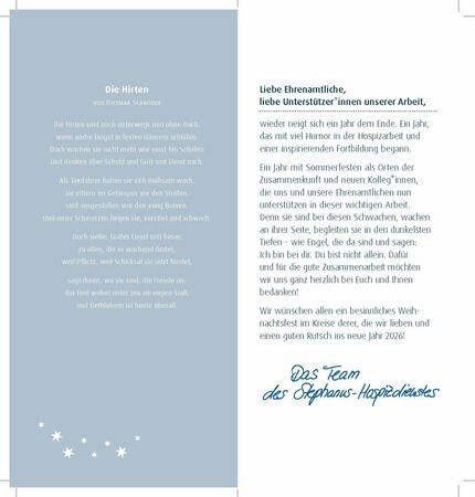 Liebe Spenderin, lieber Spender, wenn ein Kind schwer erkrankt oder ein Elternteil um sein Leben kämpft, gerät die ganze Familie in einen Ausnahmezustand. Plötzlich dreht sich alles um Arzttermine, Ängste und die bange Frage: Wie geht es weiter? Geschwisterkinder fühlen sich oft übersehen, Eltern sind am Limit ihrer Kräfte. Der Kinder- und Familienhospizdienst ist in diesen Momenten da – ganz praktisch im Alltag, mit offenem Ohr und helfenden Händen. Und wenn das Unfassbare geschieht und ein geliebter Mensch stirbt, fängt die Trauerarbeit die Kinder und Jugendlichen auf. In den Trauergruppen dürfen sie sein, wie sie sind: traurig, wütend, manchmal auch wieder fröhlich. Hier sind sie nicht allein. Mit Ihrer Spende machen Sie genau das möglich. Sie schenken Familien in ihrer dunkelsten Zeit Licht und Halt. Sie geben trauernden Kindern einen Ort, an dem sie verstanden werden. Dafür danken wir Ihnen von ganzem Herzen. Wir wünschen Ihnen ein gesegnetes Weihnachtsfest, Momente der Geborgenheit und für das neue Jahr Gesundheit, Zuversicht und Gottes Segen. Mit herzlichen Grüßen