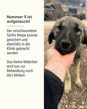 Und noch eine gute Nachricht - das fünfte Geschwisterchen wurde inzwischen ebenfalls an der Futterstelle in den Bergen gefunden und auch zum Tierarzt gebracht 🐶 Aber es geht ihr so weit gut. Auch ihr Parvotest war positiv, daher wird sie erstmal beim Tierarzt behandelt.