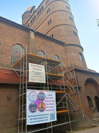 Aktuell steht das Gerüst an der Südseite der Pauluskirche. Hier werden die Schäden an Beton und Klinker gerade mit unterschiedlichen Sanierungsschritten behoben und mit Fachleuten und dem Denkmalamt abgestimmt, um die bestmögliche Erhaltung der Pauluskirche zu ermöglichen. Uns fehlen für den Bauerhalt noch knapp 190.000 EUR.