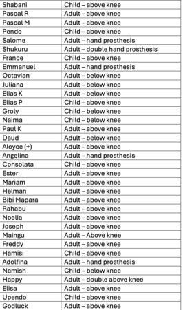 Seit 2021 haben wir kontiunierlich Hand-, Arm, Fuß- und Beinprothesen fertigen lassen. Die nachfolgende Aufstellung zeigt einen Ausschnitt der letzten 3 Jahre. Insgesamt konnten wir bisher 70 Prothesen beschaffen und haben diese komplett mit durchschnittlich 1.000 € finanziert.