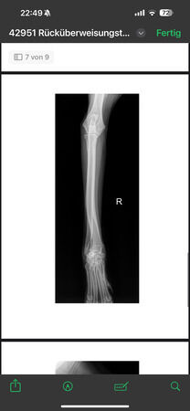 Ellbogenarthrose, leichtgradige Fehlstellung Unterarm li., auch leichtgradige Fehlstellung Radius re.