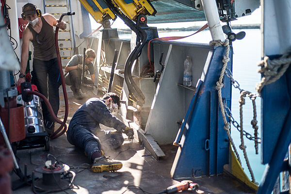 Unermüdlich bessert die Crew rostige Stellen aus. Foto: Boris Nienhaus — sea-watch.org