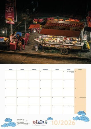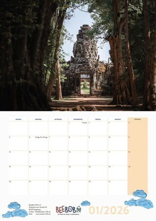 Die Bilder entstanden während der vergangenen BeeBob-Reisen. Morgendliche Tempelszenen bei Angkor Wat, Händlerinnen, die auf dem Markt ihre Waren anpreisen, und weite Blicke in die beeindruckende Landschaft von Südostasien: der Kalender zeigt auch in diesem Jahr wieder viele verschiedene Aspekte des kambodschanischen Alltags.