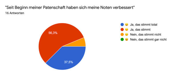 Regelmäßig überprüfen wir die Wirkung unseres Projekts und die Zufriedenheit von Pat*innen und Patenkindern in einer anonymen Umfrage. Alle befragten Patenkinder sind zufrieden mit uns und würden uns weiterempfehlen. 93% gaben außerdem an, dass sich ihre Noten durch die Patenschaft verbessert haben. Bei den befragten Pat*innen sind 89 % zufrieden und 98 % würden uns weiterempfehlen.
