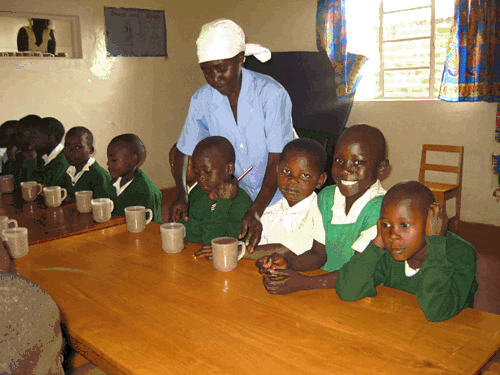 Porridge-Mahlzeit vor der Schule zu uns kommen. Auch Obst und Tee gibt