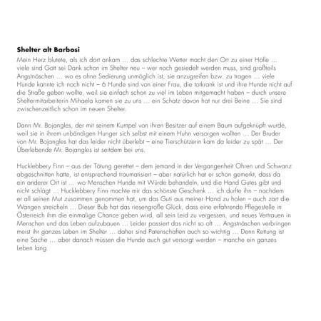 Dann Mr. Bojangles, der mit seinem Kumpel von ihren Besitzer auf einem Baum aufgeknüpft wurde, weil sie in ihrem unbändigen Hunger sich selbst mit einem Huhn versorgen wollten … Der Bruder von Mr. Bojangles hat das leider nicht überlebt – eine Tierschützerin kam da leider zu spät … Der Überlebende Mr. Bojangles ist seitdem bei uns … Hucklebbery Finn – aus der Tötung gerettet – dem jemand in der Vergangenheit Ohren und Schwanz abgeschnitten hatte, ist entsprechend traumatisiert – aber natürlich hat er schon gemerkt, dass da ein anderer Ort ist … wo Menschen Hunde mit Würde behandeln, und die Hand Gutes gibt und nicht schlägt …