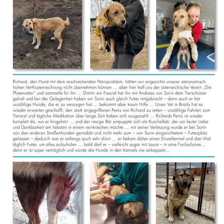 Richard, den Hund mit dem erschreckenden Penisproblem, hätten wir angesichts unserer astronomisch hohen Vet-Kostenrechnung nicht übernehmen können … aber hier half uns der österreichische Verein „Die Pfotenretter“ und sammelte für ihn … Dimitri ein Freund hat ihn mit Andreas von Sorin dem Tierschützer geholt und bei der Gelegenheit haben wir Sorin auch gleich Futter mitgebracht – denn auch er hat unzählige Hunde, die er zu versorgen hat ... bekommt aber kaum Hilfe … Unser Vet in Braila hat es wider Erwarten geschafft, den stark angegriffenen Penis von Richard zu retten – unzählige Fahrten zum Tierarzt und tägliche Medikation über lange Zeit haben sich ausgezahlt … Richards Penis ist wieder komplett da, wo er hingehört … und der riesige Bär entpuppte sich als Kuschelbär, der vor lauter Liebe und Dankbarkeit am liebsten in einem reinkriechen möchte … mit seiner Verletzung wurde er bei Sorin von den anderen Straßenhunden gemobbt und nicht mehr zum – von Sorin eingerichteten – Futterplatz gelassen – dadurch war er anfangs auch sehr dünn … er bekam daher einen Einzelkennel und drei Mal täglich Futter, um alles aufzuholen … bald darf er – vielleicht sogar mit Laura – in eine Freilaufzone… denn er ist super verträglich und würde die Hunde in den Kennels nie ankeppeln…