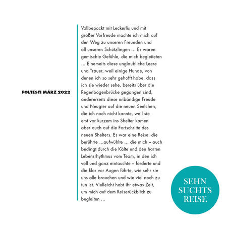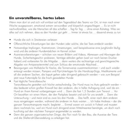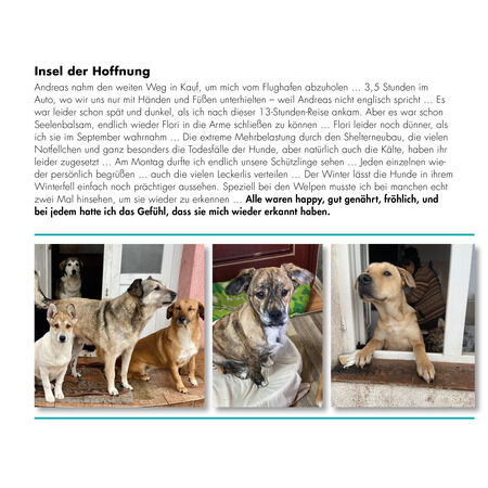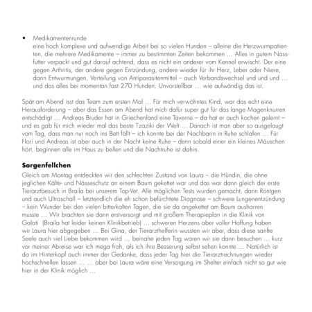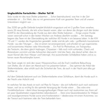 Wenn man dort ist und sich voll einlässt auf den Tagesablauf des Teams vor Ort, ist man nach einer Woche ausgepowert, emotional extrem verwundbar und körperlich angeschlagen … Es ist nicht nachvollziehbar, wie die Menschen all das schaffen … Tag für Tag ohne einen Ruhetag. Was sie alles auf sich nehmen, dass es den Hunden gut geht … Immer ist etwas los … dauernd etwas zu tun
