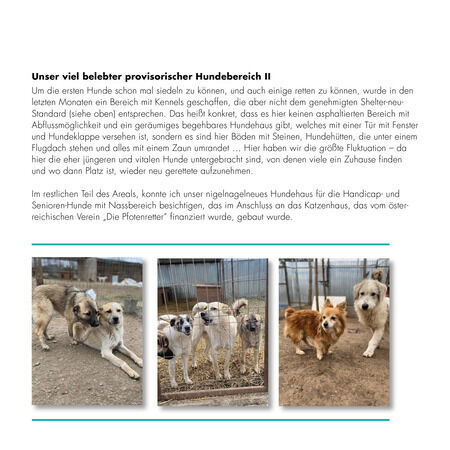 Um die ersten Hunde schon mal siedeln zu können, und auch einige retten zu können, wurde in den letzten Monaten ein Bereich mit Kennels geschaffen, die aber nicht dem genehmigten Shelter-neu-Standard (siehe oben) entsprechen. Das heißt konkret, dass es hier keinen asphaltierten Bereich mit Abflussmöglichkeit und ein geräumiges begehbares Hundehaus gibt, welches mit einer Tür mit Fenster und Hundeklappe versehen ist, sondern es sind hier Böden mit Steinen, Hundehütten, die unter einem Flugdach stehen und alles mit einem Zaun umrandet … Hier haben wir die größte Fluktuation – da hier die eher jüngeren und vitalen Hunde untergebracht sind, von denen viele ein Zuhause finden und wo dann Platz ist, wieder neu gerettete aufzunehmen.