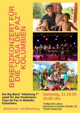 sehr herzlich lade ich Sie zu unserem nächsten Benefizkonzert zugunsten unserer Arbeit in der Casa de Paz ein: Am Samstag, dem 11.10.2025 spielt die Big Band "Abteilung 7" um 19:00 Uhr in der Kirchengemeinde "Treffpunkt Leben" in Karlsruhe.